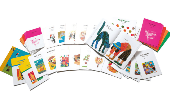 教材には、各レベルによって異なるテイストの異なるイラストが使用されています。 毎月1冊のテキストを使用しますが、イラストは各テキストごとに作者が異なり 中にはエリックカール美術館が選定した絵を使用しているものもあります。